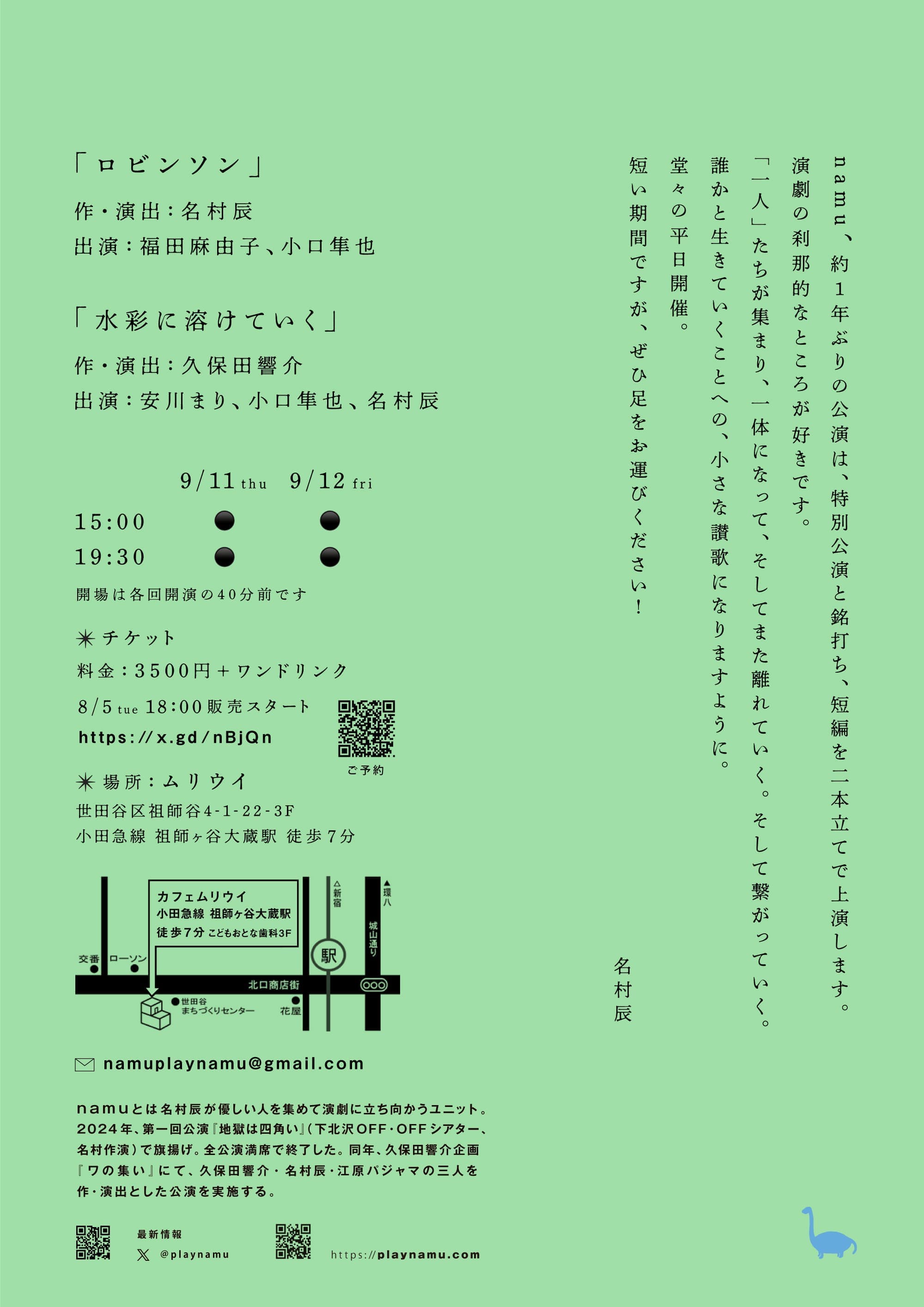 namu、約1年ぶりの公演は、特別公演と銘打ち、短編を二本立てで上演します。