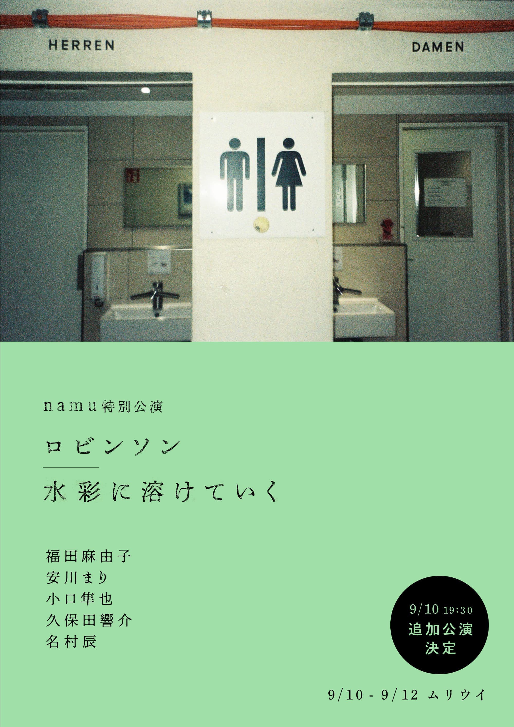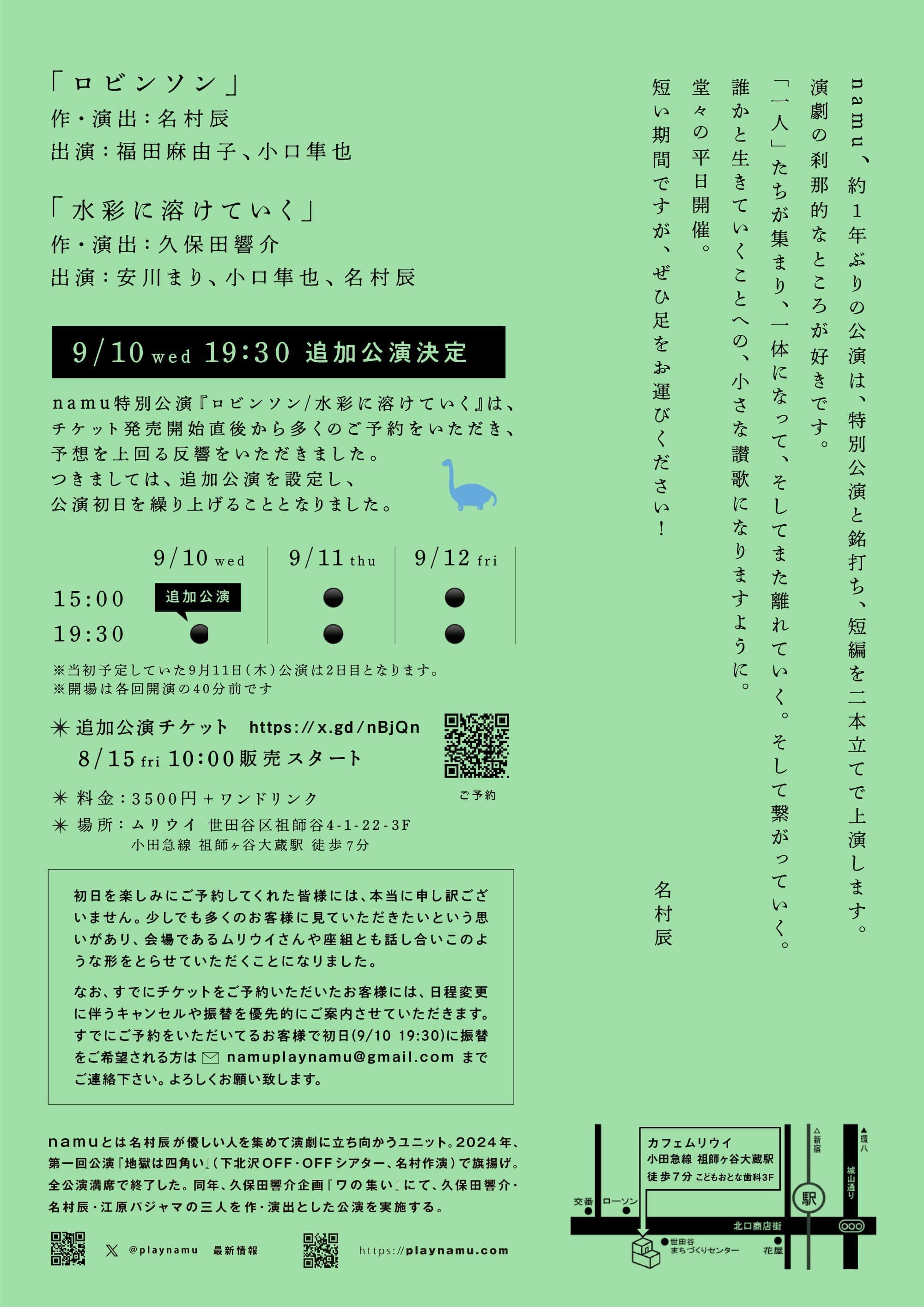 namu特別公演『ロビンソン / 水彩に溶けていく』は、チケット発売開始直後から多くのご予約をいただき、予想を上回る反響をいただきました。つきましては、追加公演を設定し、公演初日を繰り上げることとなりました。